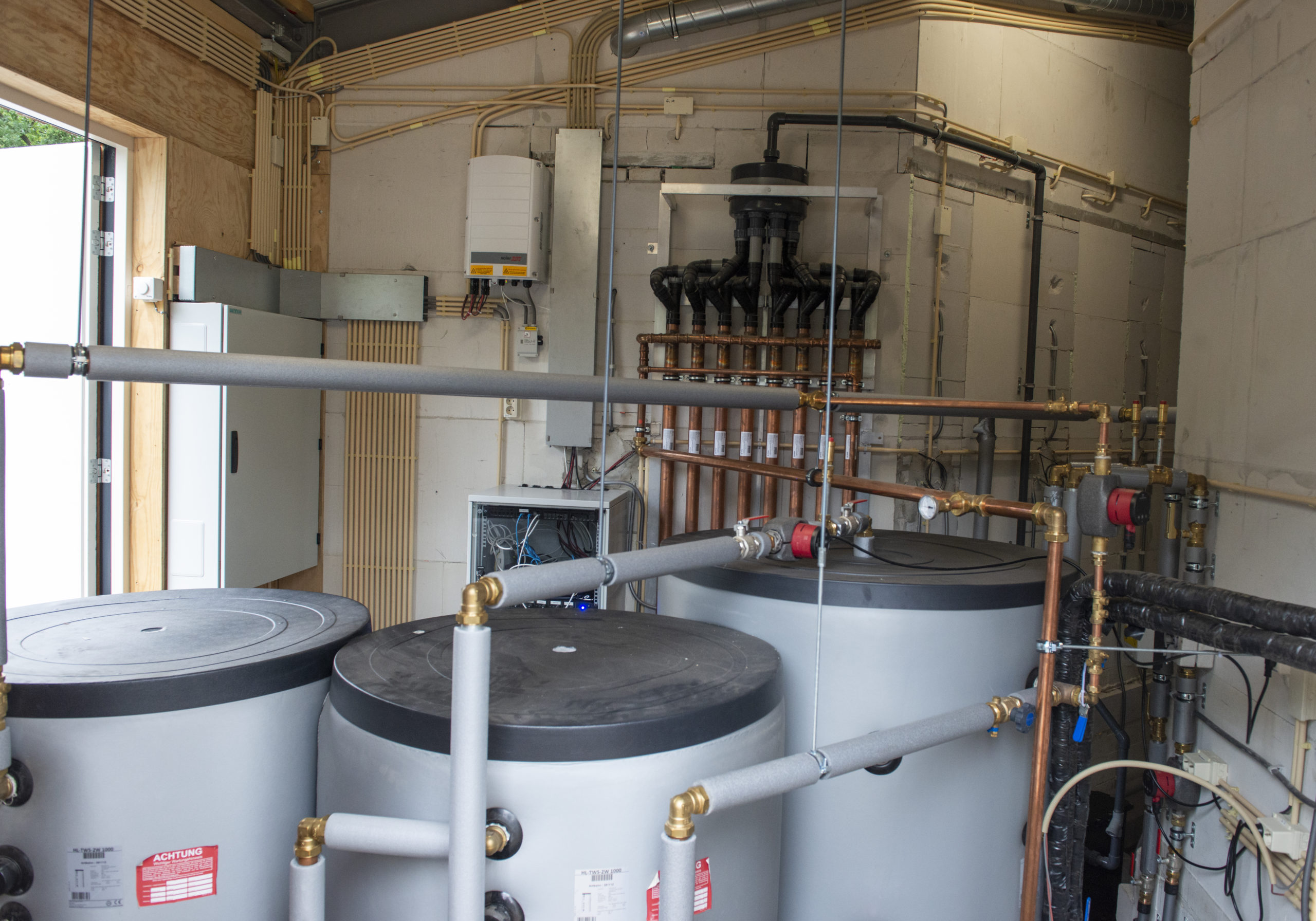 De twee Technea warmtepompen (12-34 kW) zijn in cascade geplaatst en verwarmen het 1500 liter buffervat. Dit vat fungeert als hart van de complete installatie en wordt eveneens geladen door de zeven thermische collectoren.